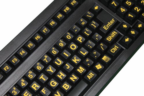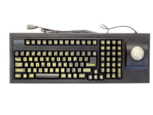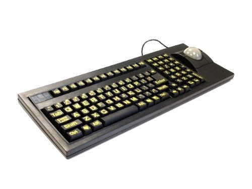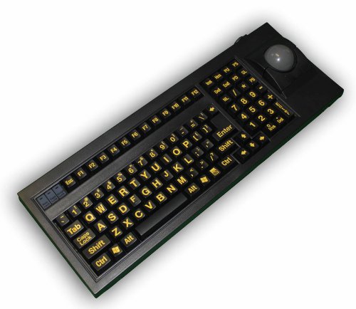 - Feature : Works with Windows 98, 2000, ME, XP, Vista and Windows 7 / Yellow Large Print with UV coating, Cherry Mechanical key switch / built in 51 mm Trackball and 3 standard mouse buttons / Designed specifically for those with conditions that cause visual impairment or low vision / wrist pad dimension: 17.5" x 2.4" x 0.55" (inch), keyboard dimension: 17.5" x 5.7" x 1" (inch)