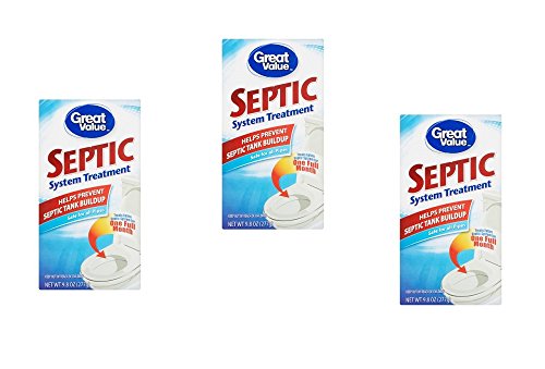-. Brand : Great Value -. Color : White -. EAN : 0631907734639 -. Feature : Helps prevent septic tank buildup / Safe for all pipes / Treats entire septic system for one full month -. Label : Great Value -. Manufacturer : Great Value -. PackageQuantity : 3 -. ProductGroup : Kitchen -. ProductTypeName : KITCHEN -. Publisher : Great Value -. Size : 1.38 x 4.30 x 8.03 In -. Studio : Great Value -. Title : Septic System Treatment, 9.8 oz (Pack of 3) -. UPC : 631907734639