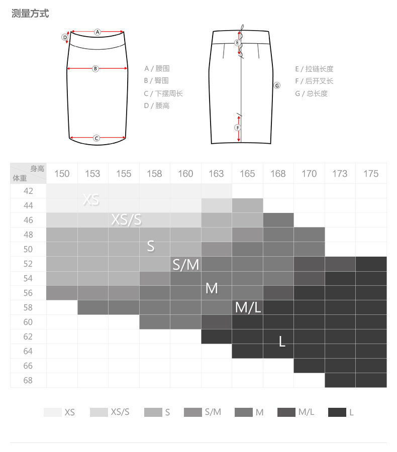 身高/净腰围 腰围 臀围 裙长 底围 显示尺寸