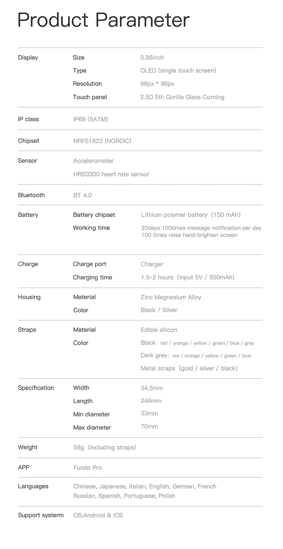 Function:Week,Message Reminder,Passometer,Activity Tracker,Blood Oxygen,Fitness Tracker,Blood Pressure,Call Reminder,Sleep Tracker,Heart Rate Tracker,Social Media Notifications,Push Message
