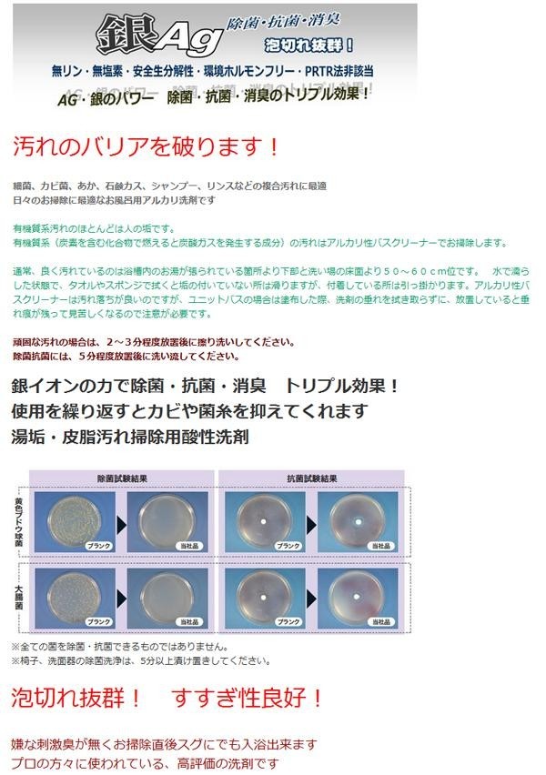 | 銀イオンの力で除菌抗菌消臭強力洗浄。カビ菌の元となる皮脂汚れ湯垢掃除に最適で、刺激臭のないお風呂掃除用アルカリ性洗剤です。詰め替えサイズとスプレータイプのセットです。 |