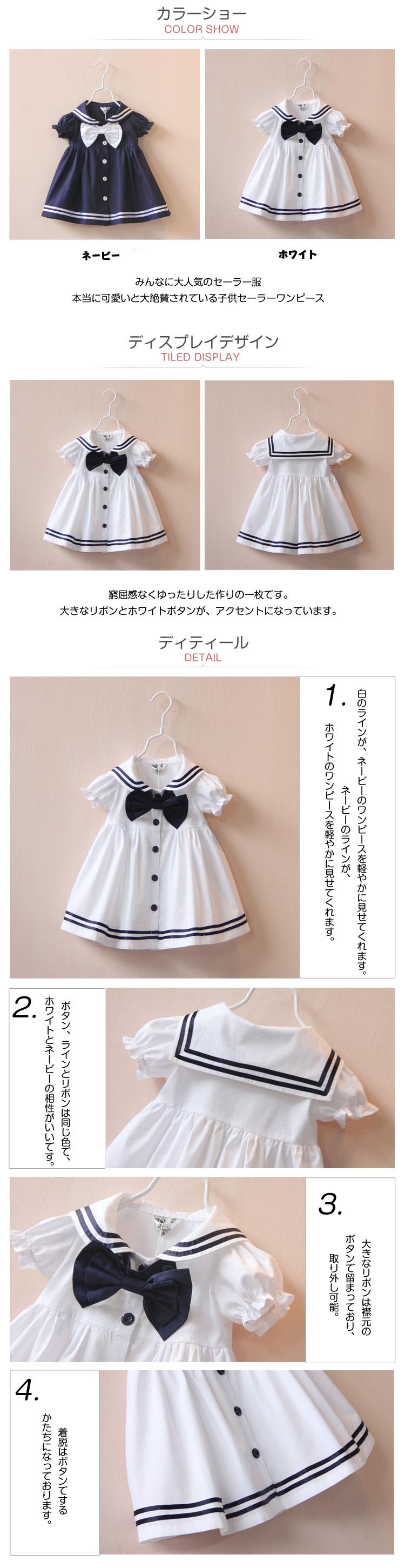 | みんなに大人気のセーラー服?本当に可愛いと大絶賛されている子供セーラーワンピース窮屈感なくゆったりした作りの一枚です。大きなリボンとホワイトボタンが、アクセントになっています。入学式や発表会などさまざまなシーンで大活躍できます。誕生日プレゼントにも喜ばれるね? | |