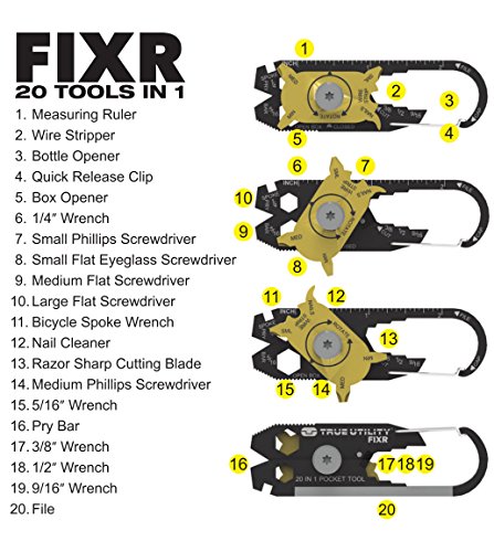 True utility has created a 'revolution' in multi-tools...the fixr -- it's 20 tools in 1. The fixr features an easy, portable solution for all of your everyday tools. It's the perfect tool that does everything for the person who does everything! equipped with a quick release clip, the fixr easily attaches to a key ring or belt loop. A gold plated revolving disc allows tools to be exposed while in use, so they are never in the way when you don't need them. 20 tools in 1 (quick release clip, bottle opener, cutting blade, pry bar, nail file, box opener, large flat DRIVER, medium flat DRIVER, eyeglass screwdriver, medium PHILLIPS DRIVER, small PHILLIPS DRIVER, bicycle spoke wrench, measuring ruler, 1/4 inch wrench, 5/16 inch wrench, 3/8 inch wrench, 1/2 inch wrench, 9/16 inch wrench) features: fixr is 200 tools in 1 easy to use and portable tools attaches to key ring or belt loop gold plated revolving disc product specifications: manufacturer: true utility.Feature