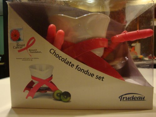 Set includes a white stoneware pot, "pink ribbon" sturdy metal stand, safety burner, and two (pink) chocolate forks