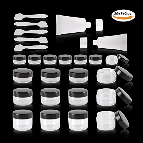 - Travel bottles containers set: includes 20pieces empty clear plastic sample container with black lid(3g,5g, 10g,15g,20g) &2 Squeezable Leak-proof Refillable Bottles(20&30ml) & 5 pieces spatulas; Good for travel use