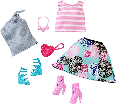 Barbie doll has the clothing and accessories for any occasion! Take her from sophisticated chic to casually cool, from daytime to nighttime and anywhere in between with this set. Barbie doll has extra fashions for mix-and-match fun to help explore your style. She wears a trendy red polka dot skirt and vibrant violet tank with a fabulous pair of purple booties and blue statement necklace. But change her look in an instant! Three additional fashions -- that include two tops and a second skirt -- can create a whole new outfit. Each piece of clothing is inspired by today’s trends, like a pretty pink striped shirt, a sleek one-shoulder top with a knot detail and a teal floral skirt with pops of color. Switch up the looks even more with the accessories -- a second pair of teal shoes and a sweet heart-detailed purse -- are fun statements. Create a look, tell a story and then start again because with Barbie, you can be anything! Collect all of the Barbie doll fashion sets to expand the options for creative expression and storytelling fun (each sold separately, subject to availability). Includes Barbie doll wearing top, bottom, necklace and shoes, plus two additional tops, a second skirt, an extra pair of shoes and a purse. Doll cannot stand alone. Fashions fit most Barbie dolls. Colors and decorations may vary.Feature