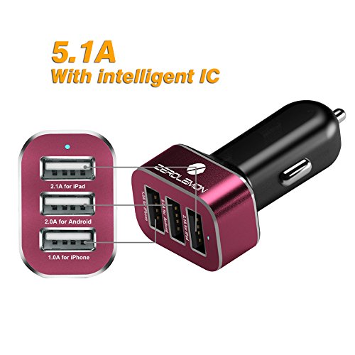 ZeroLemon Car Charger 5.1Amps / 25.5W Triple USB Aluminum Shield Rapid Charger usb for iphone/ipad/android-Red/Black