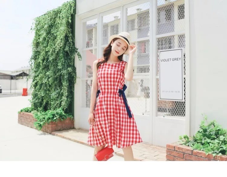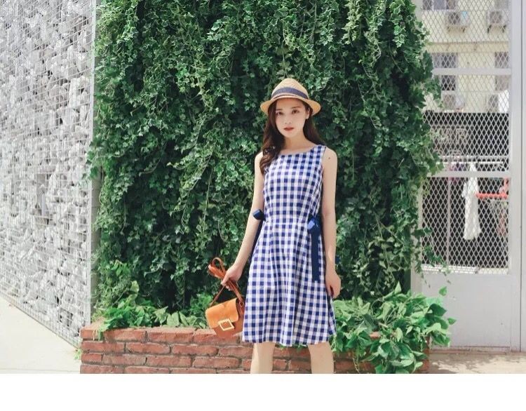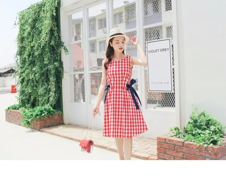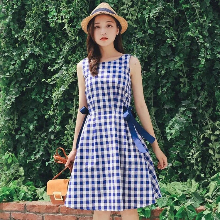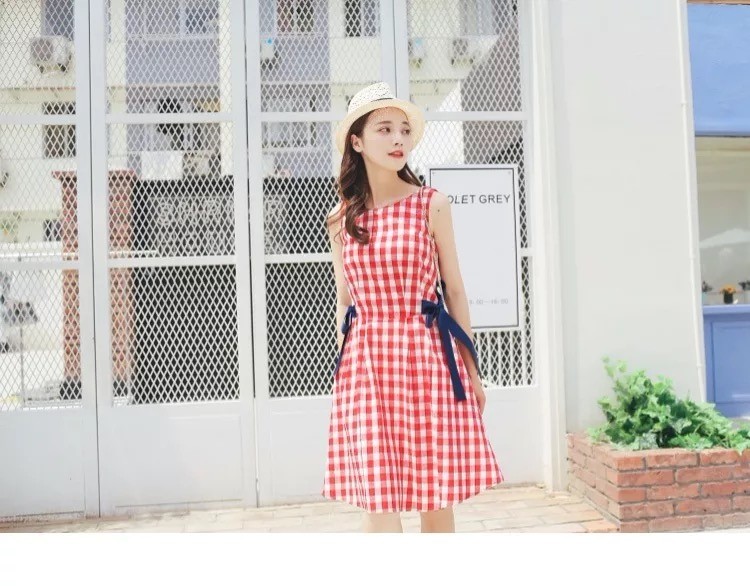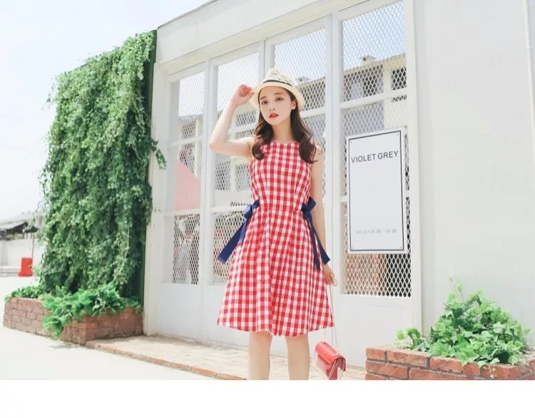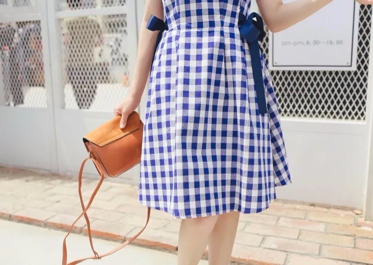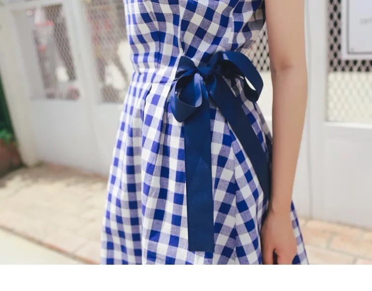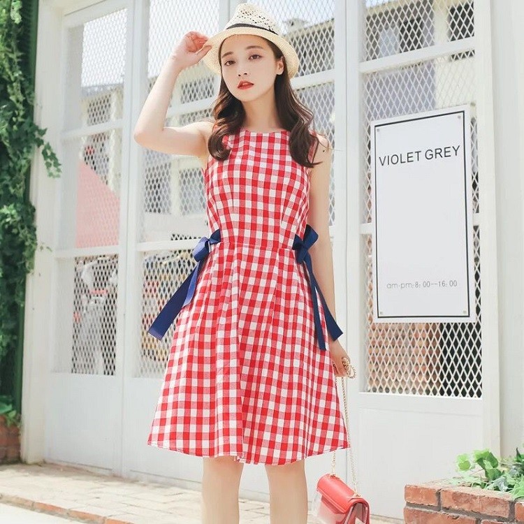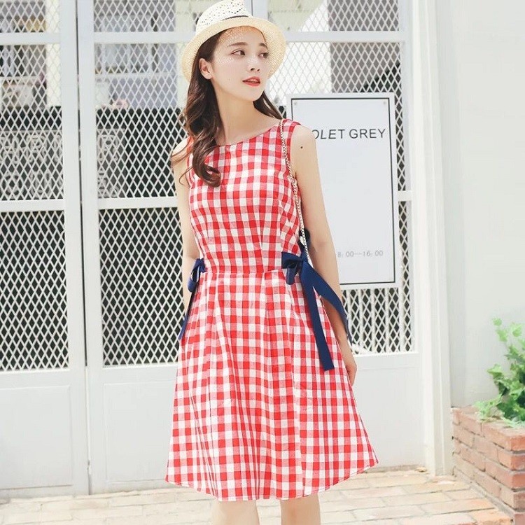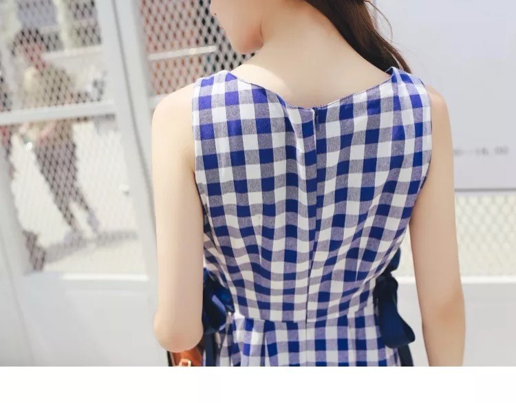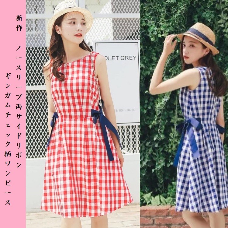 かわいい両サイドリボンのノースリーブギンガムチェック柄Aラインワンピースです。