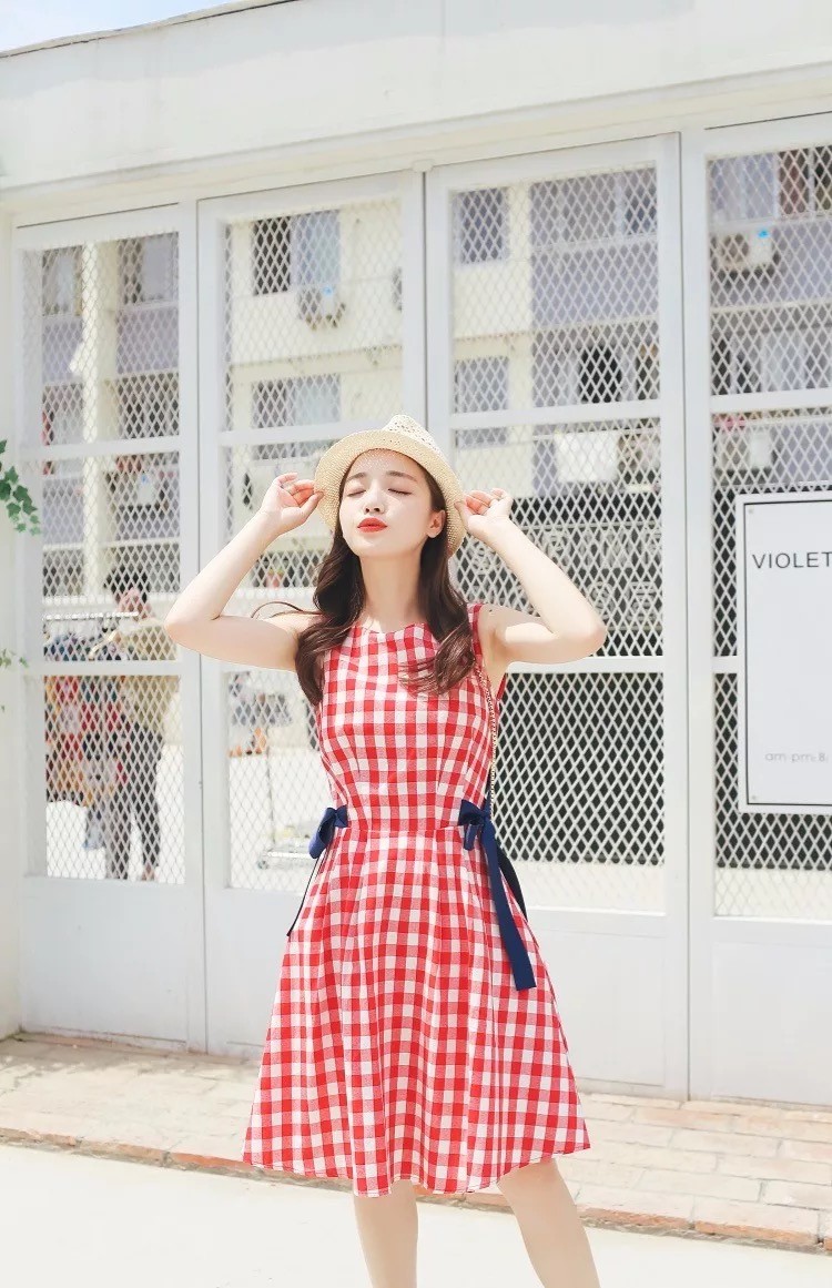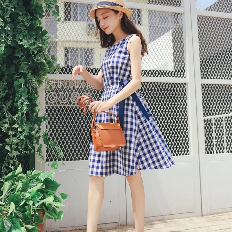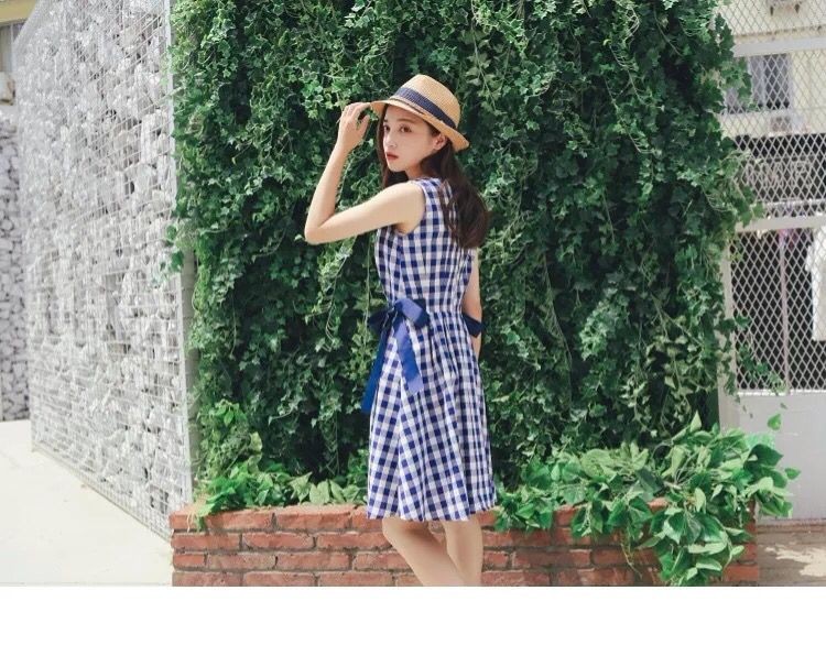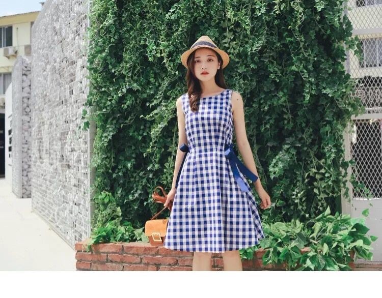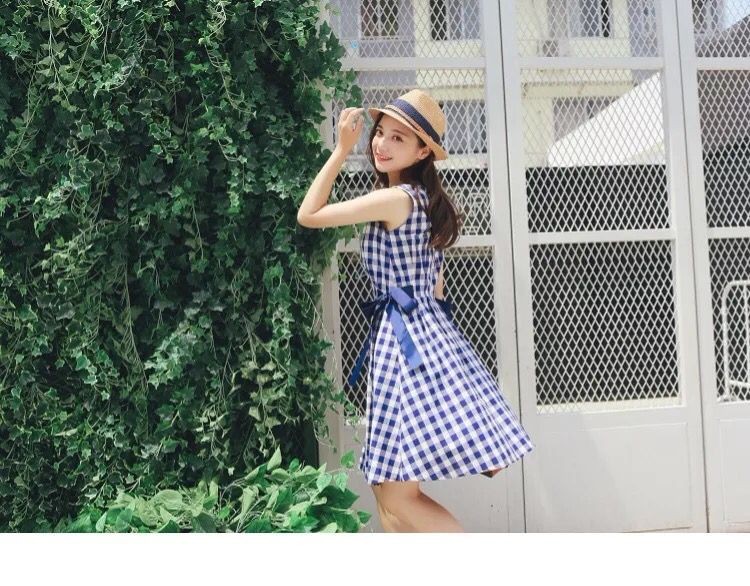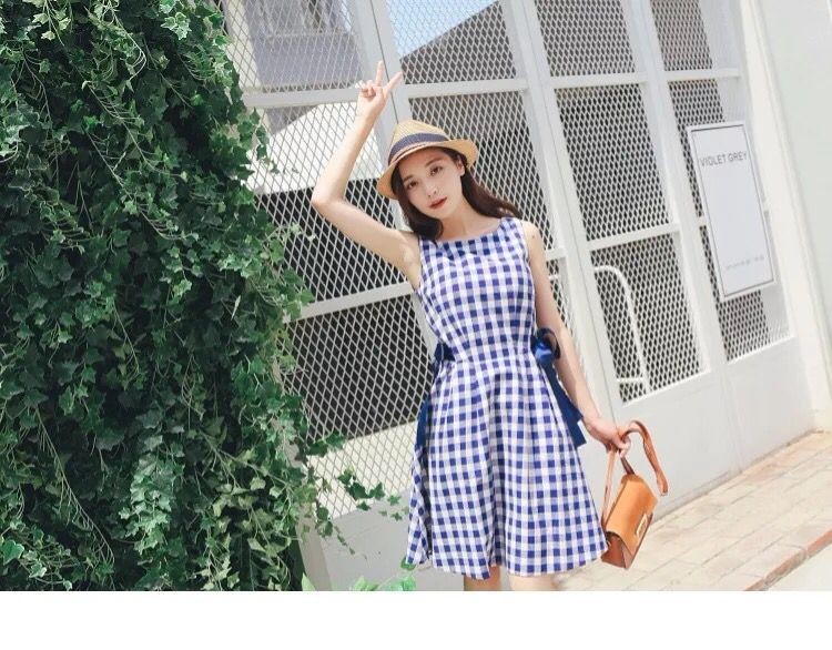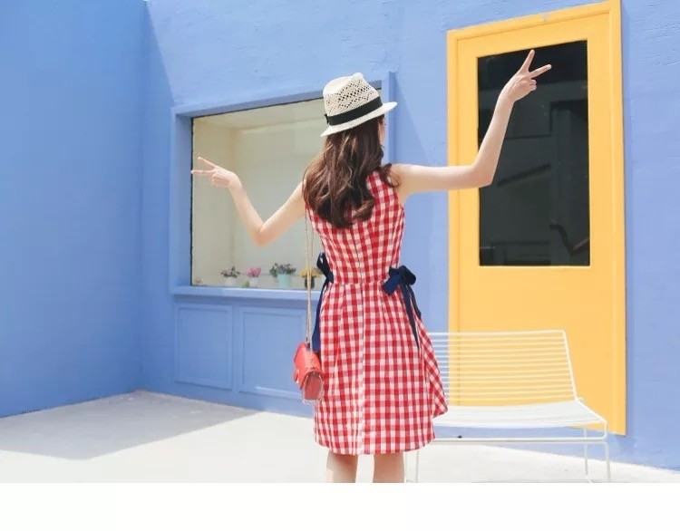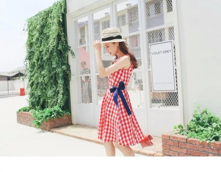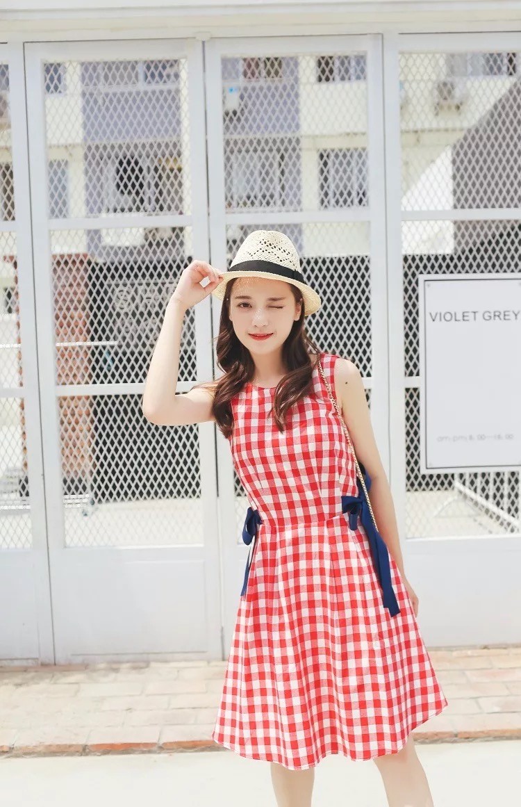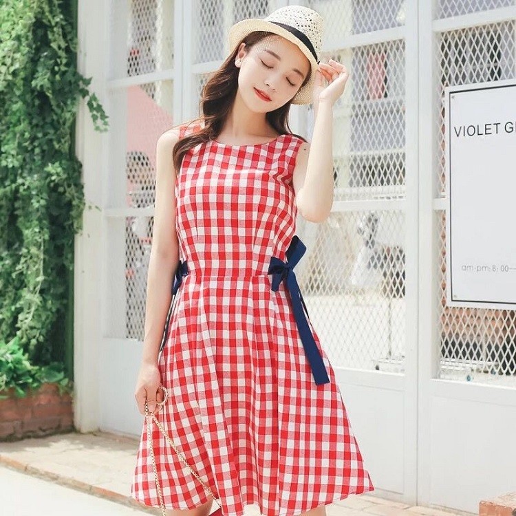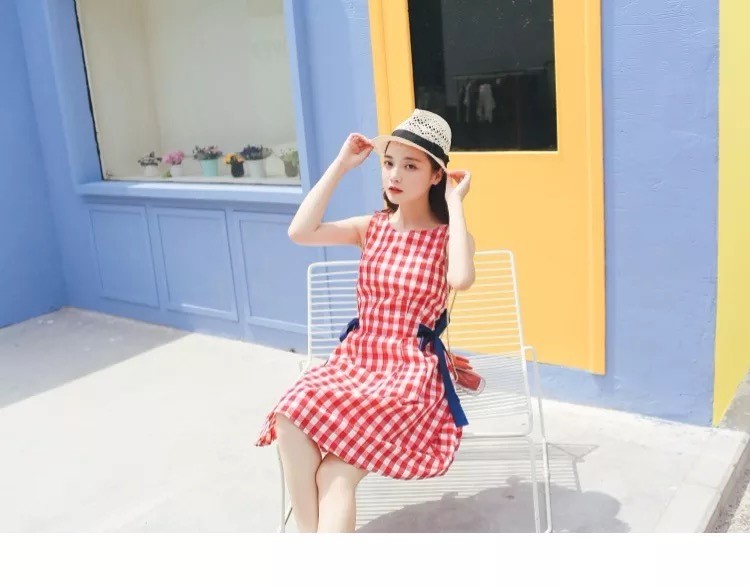 かわいい両サイドリボンのノースリーブギンガムチェック柄Aラインワンピースです。