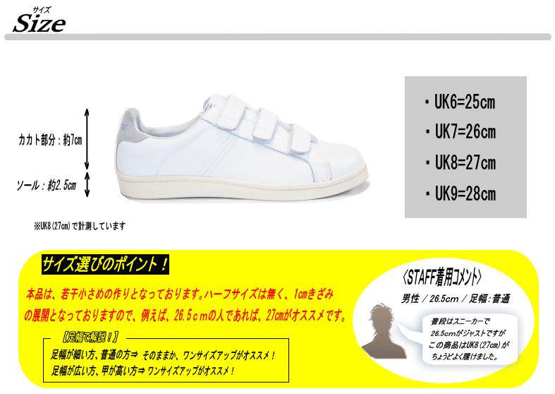 | サイズ | 作り⇒少し小さめ 【サイズ選びのポイント!】 足幅が細い方、普通の方⇒そのままか、1サイズアップがオススメ! 足幅が広い方、甲が高い方⇒1サイズアップがオススメ! |