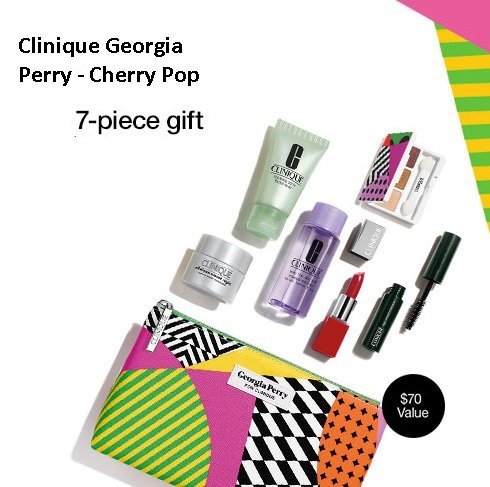 -. Feature : Brand new 7 piece Georgia Perry Clinique gift set includes: Black high impact mascara Cherry Pop lip colour + P.R.Imer Smart night custom repair moisturizer Take The Day Off Makeup Remover Foaming sonic facial soap Limited Edition eyeshadow trio (neutral colors) Super cute Georgia Perry makeup bag