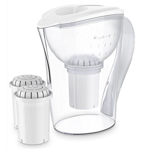 MODERN DESIGN (Improved 2017 MODEL) - Easy-to-Fill Lid System & Digital Gauge so you know when to change your filter. Anti-Block latest technology PH001 filter (search B00X127CGE). Capacity per PH001 Filter = 1500 cups/96 gallons/350 litres per filter. PREMIUM ECO-FRIENDLY MATERIALS - BPA free & food grade, SGS Certified, MEMBER OF THE WATER QUALITY ASSOCIATION.