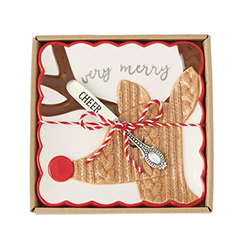 Studio : One Coast Publisher : One Coast Product Description 2-piece set. Ceramic cheese plate features scalloped rim and raised reindeer icon with cable knit textural details, "very merry" sentiment and arrives with stamped silverplate "CHEER" spreader. 0