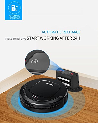 The robot vacuum seeks the charging dock after it is finished or on low battery - Built-in 1300mAh rechargeable battery allows for 60 minutes of cleaning before returning to the electric charger.