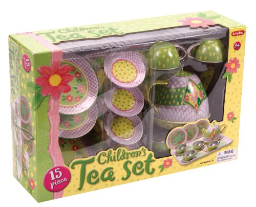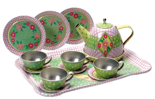 15 Piece Tin Tea Set Contains: Teapot and Lid; 4 Plates; 4 Cups and Saucers and a Serving Tray Box size: 30 x 9 x 20 cm