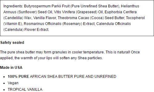 Pure Shea Butter Lip Balm Vanilla 0.25 oz Lip BalmLuscious Lip Balm with Pure Unrefined Shea Butter 100% Natural and VeganOur Shea Butter Lip Balm will melt on your lips. 30% of this formula is pure and unrefined shea butter the highest amount in the market Most others have 1 or 2%.