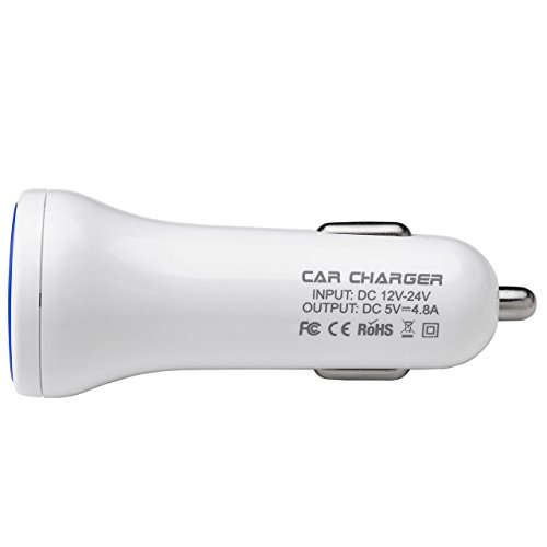 Dual USB ports: Input: DC 12-24V; Output:DC 5V=4.8A;Package Contents: 1*2-Port Car Charger