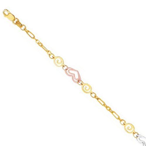 -. Binding : Jewelry -. Brand : JewelStop - 14K Yellow Gold Anklets -. Department : womens -. Feature : JewelStop fancy chain anklet that has got a stunning design. / The tri-color gold chain anklet has been crafted in 14k gold. / The anklet is tri-Color gold in color. / We offer you 1 year warranty plus 30 days money back guarantee. / The product dimensions are: 10" long and mm in width. -. Label : JewelStop -. Manufacturer : JewelStop -. PackageQuantity : 1 -. ProductGroup : Jewelry -. ProductTypeName : FINENECKLACEBRACELETANKLET -. Publisher : JewelStop -. Studio : JewelStop -. Title : JewelStop 14k Solid Tri-color Gold Hearts And Circles Anklet, Lobster Claw Clasp - 10"