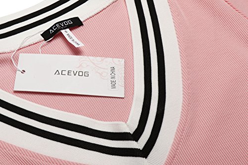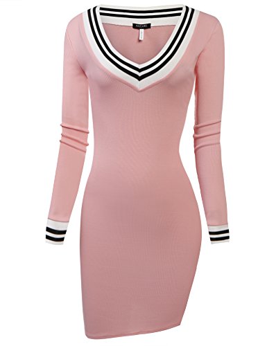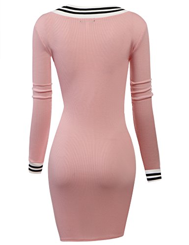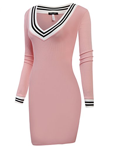 Acevog Women's V-Neck Long Sleeve Basic Knit Sweater Bodycon Mini Dress (Medium, Pink)