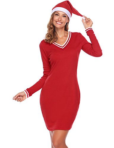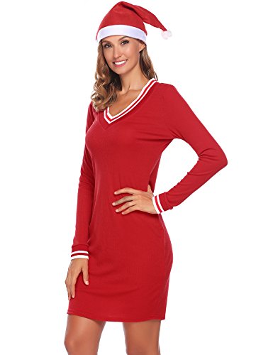 Acevog Women's V-Neck Long Sleeve Slim Fit Knit Sweater Bodycon Mini Dress (Large, Wine Red)