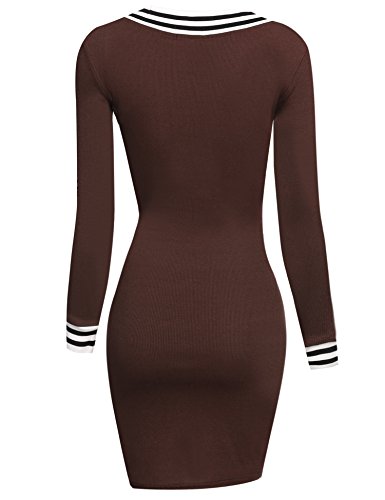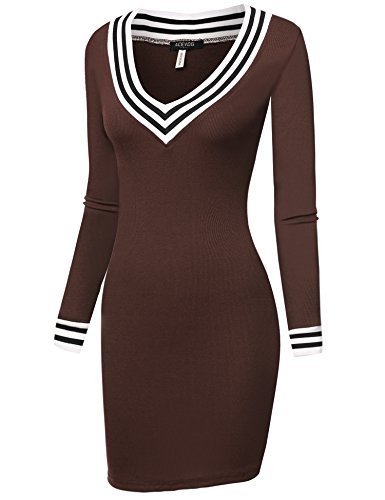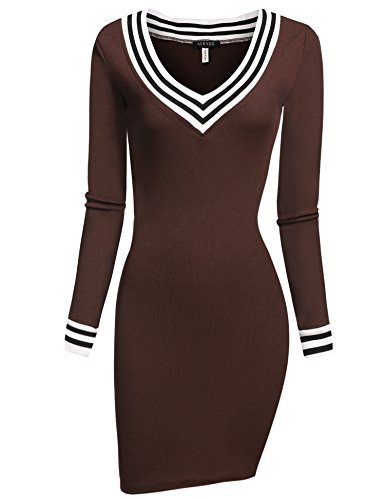 Acevog Women's V-Neck Long Sleeve Basic Knit Sweater Bodycon Mini Dress (Medium, Brown)