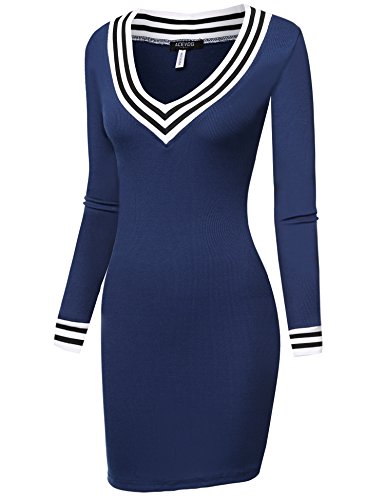 Acevog Women's V-Neck Long Sleeve Slim Fit Knit Sweater Bodycon Mini Dress (X-Large, Blue)