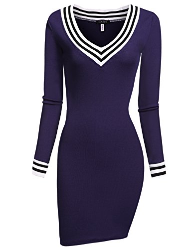 Acevog Women's V-Neck Long Sleeve Basic Knit Sweater Bodycon Mini Dress (Large, Purple)