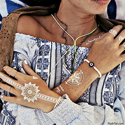 The Wanderlust, collection is perfect for when you're craving travel and adventure. This 6" X 4" travel-sized pack includes 3 sheets of metallic gold, silver and white temporary tattoos. The pack features whimsical phrases and hand-drawn designs in Pen Hearts Paper's signature style. Flash Tattoos are the original innovative jewelry-inspired temporary tattoos for serious (and not so serious) fashionistas. Flash Tattoos can by styled anywhere - feet, arms, back, rib cage, neck, hands, forehead...even nails! Get as creative as you want with placement and pairings. Perfect for the beach, the pool, parties, festivals, concerts... anywhere you and your skin might be seen having fun. Just apply, glimmer and go! All Flash Tattoos pass safety standards for the cosmetic and toy product industries. Do not apply to sensitive skin, near eyes, or if you are allergic to adhesives.Feature