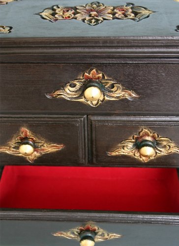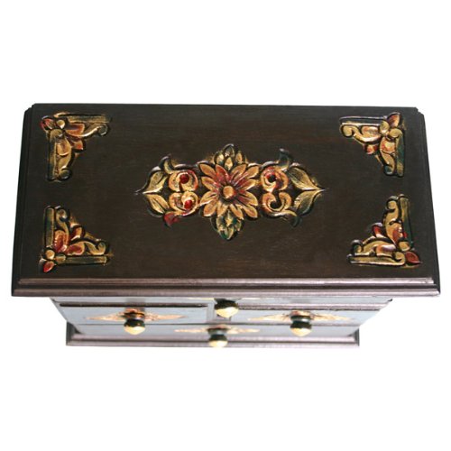 -. Binding : Kitchen -. Brand : EXP -. Color : Black -. EAN : 0846087001277 -. Feature : Each drawer has a gold-painted wooden knob and intricately etched, gold and crimson ornamentation / Rich color detail also featured in the beautiful floral carvings that embellish the top / Large top and bottom drawers ideal for necklaces and bracelets / Two smaller drawers perfect for storing for rings, earrings and other small pieces / 11 in. H x 10 in. W x 5 in. L -. Label : EXP Furniture -. Manufacturer : EXP Furniture -. Model : bxa1021 -. MPN : bxa1021 -. PackageQuantity : 1 -. PartNumber : bxa1021 -. ProductGroup : Home -. ProductTypeName : HOME -. Publisher : EXP Furniture -. Studio : EXP Furniture -. Title : EXP Handmade Hand-Etched Teak Wood Jewelry Box/Organizer with Velvet Lining -. UPC : 846087001277