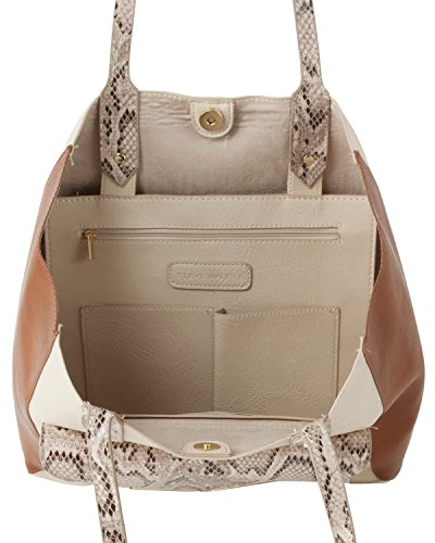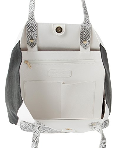 Product Description Simple and Chic, The classically-shaped bag From Steve Madden is constructed from faux leather detailed with snakeskin accents and color block design for a statement look. Top Magnetic Snap closure, flap pocket at front, and gold-tone hardware, Double Handle and Supplementary interior pockets that make it tops in organization to. 0