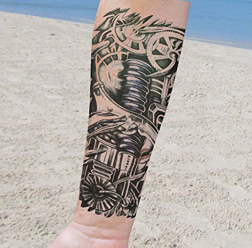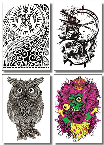 - 8 LARGE SHEETS OF DIFFERENT TATTOO DESIGNS. includes: skull & crown, owl, skull & clock, skull & roses, cyborg forearm, barbed wire, koi fish and aztec tribal. Use several tattoos to create full arm sleeve