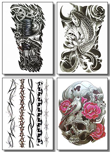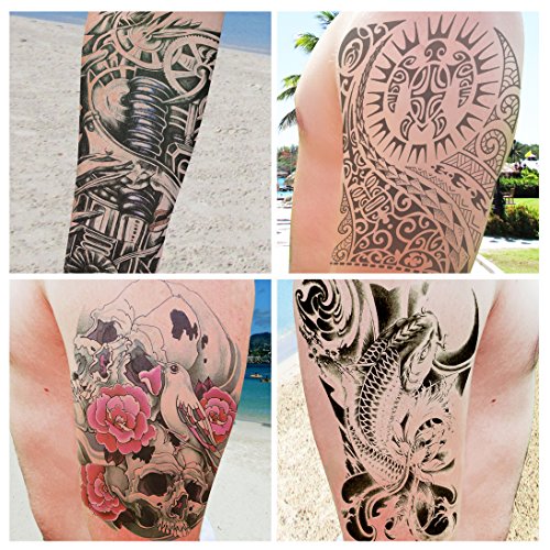 Large Temporary Transfer Tattoos Stickers For Guys Men Boys & Teens (8 Sheets) - Fake Stickers For Arms Shoulders Chest Back Legs Tribal Koi Fish Skull...