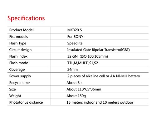 Functions: * High GN: 32 * Support TTL * Support Manual Flash (S1/S2 mode) * Support Stroboscopic mode * Adjustable Tilt & Swivel Head * LCD Lattice screen * LED-Assistive preview focus * Metal hot shoe Specification: Manual: 1/1-1/128(±1/3 increments) Repeating flash: 1-199HZ Exposure compensation: one-third-stop increments ±3 files Own master mode , can wireless control meike series slave flash Power Supply: 2 AA alkaline batteries or AA NI-MH battery Flash Index: 32 (105 mm focal length; ISO:100meters) Flash Mode: TTL/M/S1/S2/RPT/ remote control flashlight Up-Down Rotation Angle:-7°(Down)~90°(Up) Left-Right Rotation Angle:150° Batter Flashes: 100-1500 flashes (For AA alkaline batteries ) Recycle time: About 5s (For AA battery ) Color temperature: 5600K Light Sensing Distance: Indoor 15m, outdoor 10m Weight: About 150g (Flashlight only, batteries not included) Sie:110(L)*65(W)*36(H)mm Package Including: * 1 x MK-320 * 1 x Diffuser for MK-320 * 1 x Flash Stand * 1 x ManualFeature