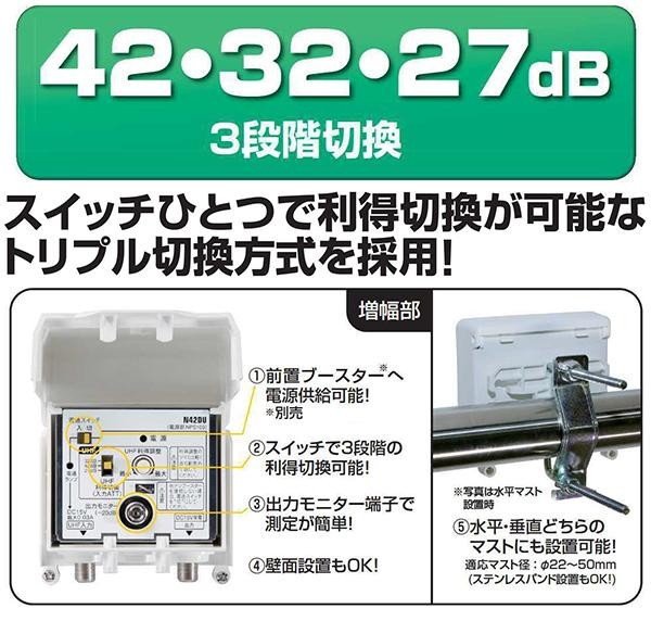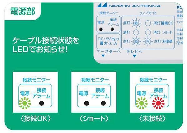 地上デジタル放送に対応した、低雑音で高出力の電源分離型ブースター。27dB・32dB・42dBに利得切替ができ、幅広い環境で使用できます。ケーブルの接続状態を電源部のLEDランプで確認できます(接続OK・ショート・未接続)。 |