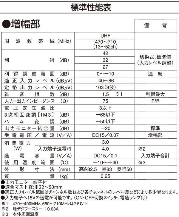 | 地上デジタル放送に対応した、低雑音で高出力の電源分離型ブースター。27dB・32dB・42dBに利得切替ができ、幅広い環境で使用できます。ケーブルの接続状態を電源部のLEDランプで確認できます(接続OK・ショート・未接続)。 |