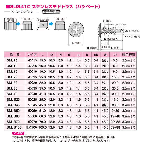 ●薄鋼板+鉄骨用ドリルビス 座ぐり穴付金物+鉄骨用ドリルビス