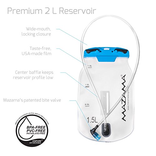 BPA FREE 1.5 liter TOP FILL BLADDER INCLUDED - The Koosah Hydration Pack will easily accommodate a 2 Liter Short Replacement bladder; All Mazama Designs bladders are manufactured with USA made, medical grade film that naturally carries no off flavors of plastic or chemicals as many lower quality bladders do - the unique camlock closure not only assures a leak free seal on your bladder but is also simple to fill.