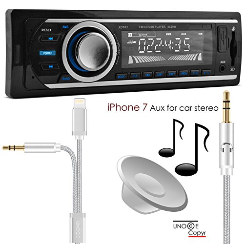 Specification Product Name: UNOOE iPhone to aux cable Material: Aluminum Nylon Length: 3ft Connector Type: Lightning port Color: Sliver Compatible: iOS and Android smartphones Package Included: 1*3ft lightning aux cable