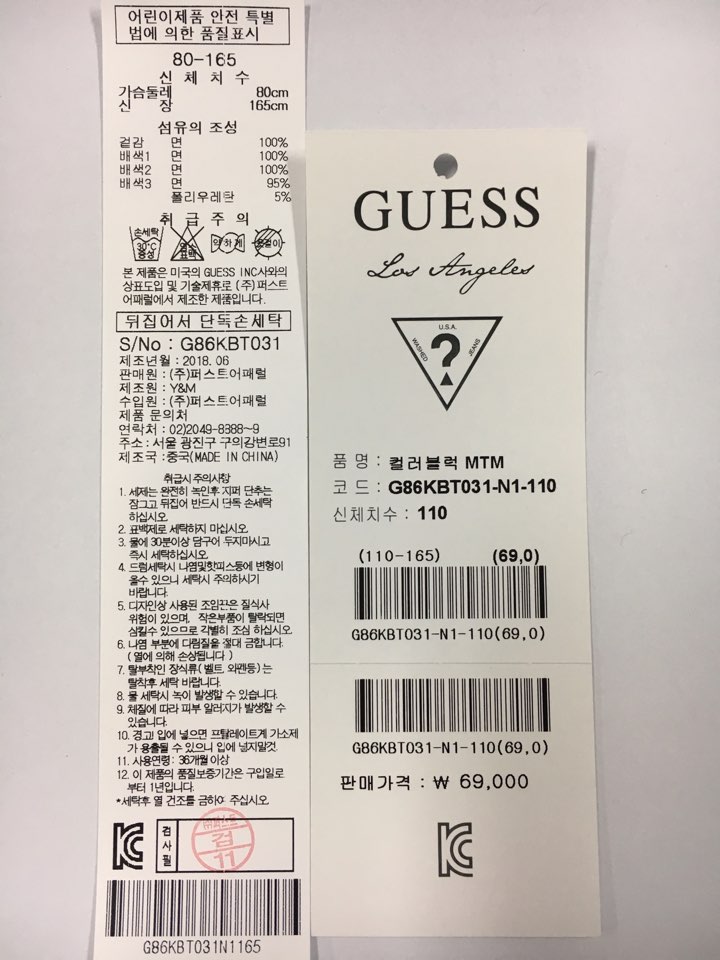 게스 오리지날 무드의 맨투맨 티셔츠로 시그니처 컬러를 블럭킹하여