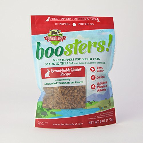 -. Binding : Misc. -. Brand : boosters -. EAN : 0855266005357 -. Feature : Novel Protein Great for Animals with Allergies and Digestive Issues / Meat blended with Fruits and Vegetables and Coconut Oil / Food Toppers / No Artificial or Synthetic Ingredients / Add a Healthy Nutrition Boost to Your Dog or Cat's Meal Every Day -. Label : Boo Boo's Best -. Manufacturer : Boo Boo's Best -. PackageQuantity : 1 -. ProductGroup : Pet Products -. ProductTypeName : PET_SUPPLIES -. Publisher : Boo Boo's Best -. Studio : Boo Boo's Best -. Title : Boo Boo's Best boosters Remarkable Rabbit Food Toppers for Dogs and Cats -. UPC : 855266005357