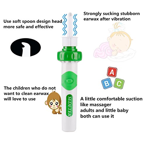Studio : SEDETER Publisher : SEDETER Binding : Health and Beauty Product Description This Ear Wax Remover is safest and easy way to clean your families ears and remove ear wax! simple to use, totally safe, easy to clean and reusable. An Ideal Ear Cleaner Tool for Family, Kids' Ear Hygiene: Compared with the stainless steel ear pick, this earpick is much more safer for your baby when you want to clean the ear canal. It's a higher cost-effective product for family daily life. Our aims to offer all our customers a healthier, more convenient and more intelligent life solution. Enable the changes bring more to people's daily life. What you choose is not only a tool, but a more healthier life style for your family and you will like it. Specification: Package Size: 12*6*3cm Package Weight: 68g Package List: 1x electric earpick 2x clean suction head 1x cleaning brush 1xAAA battery Health Tips: 1. Fingernails are not suitable to clean your ear due to bacteria are easily hidden there. 2. To avoid injury, do not use while moving. 3. Store handle and the heads in the protective case when not in use. Cleaner 2 x flexible cleaning head 1 x Cleaning brush 1 x AAA battery