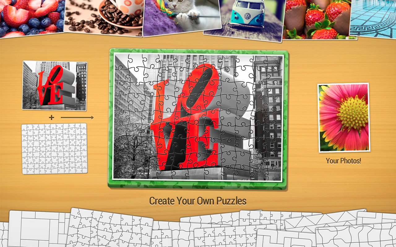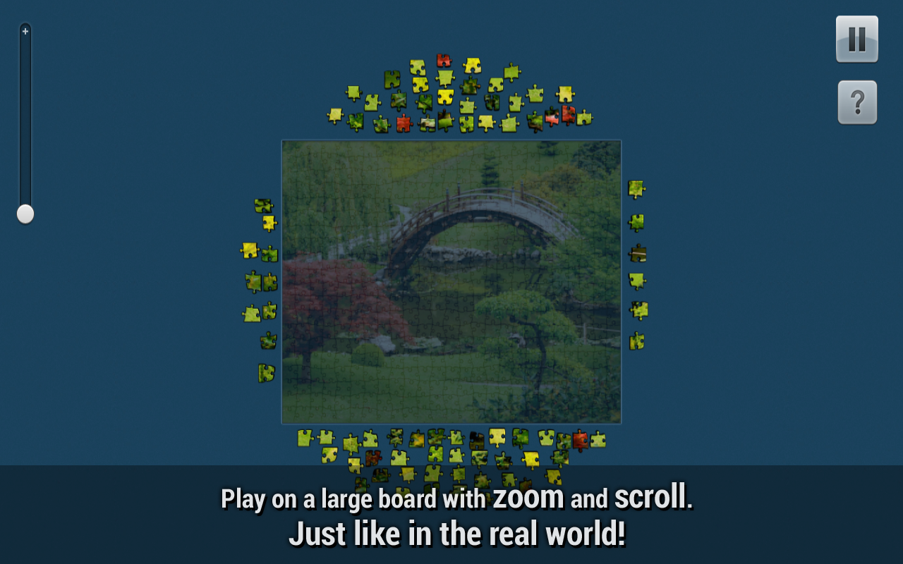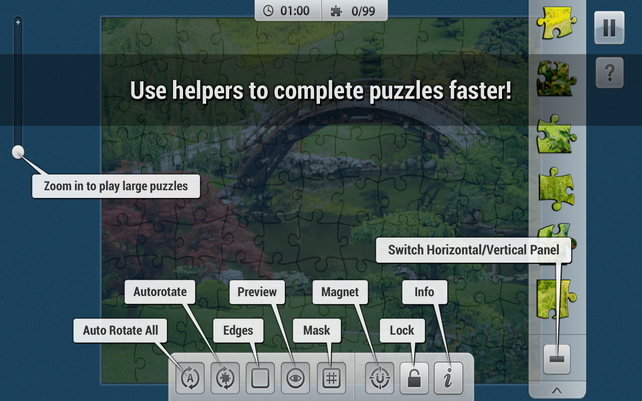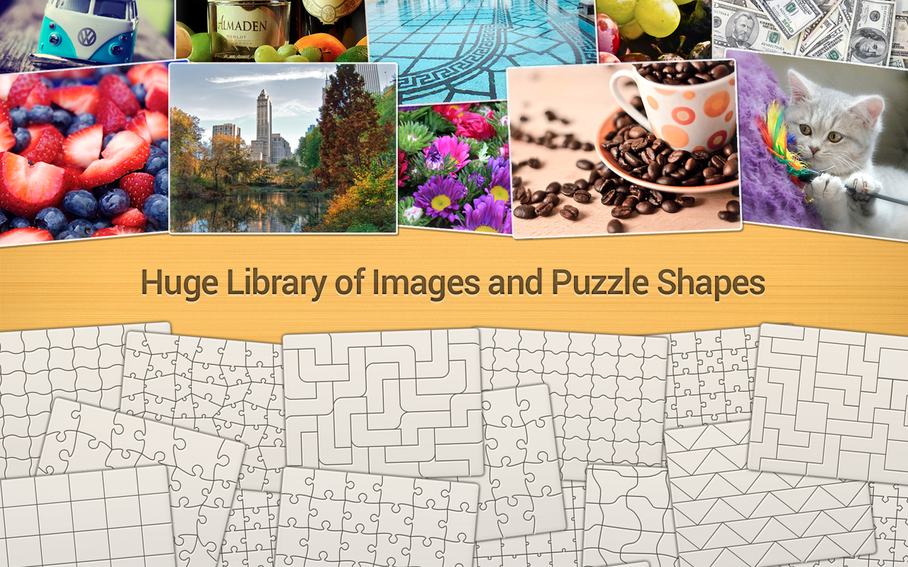 - Feature : Choose puzzle image from 4000 photos and illustrations / Apply one of over 120 different puzzle cuts with classic and custom shapes. From 6 to 1000 piece puzzles / Play with or without helpers (edges only, preview, autorotate, magnetize board) / Smooth gameplay - Large game board with scroll and zoom. Panel mode - show all loose pieces on a panel (play faster)- / Manual and automatic piece rotation