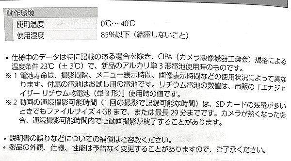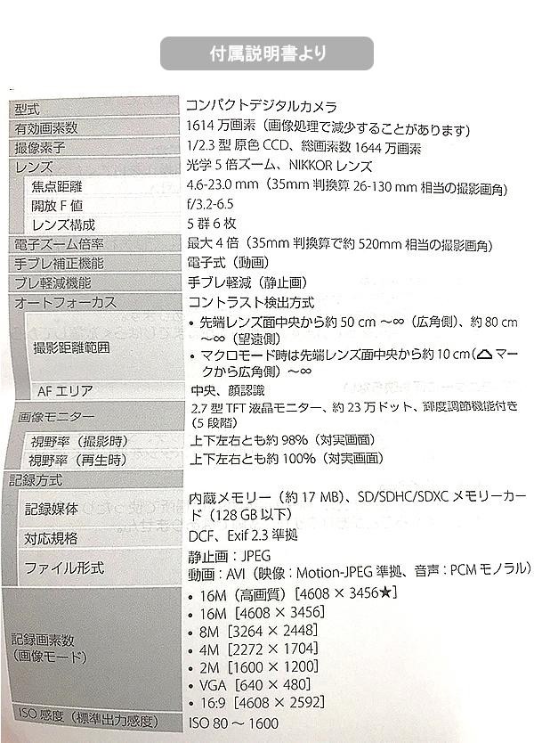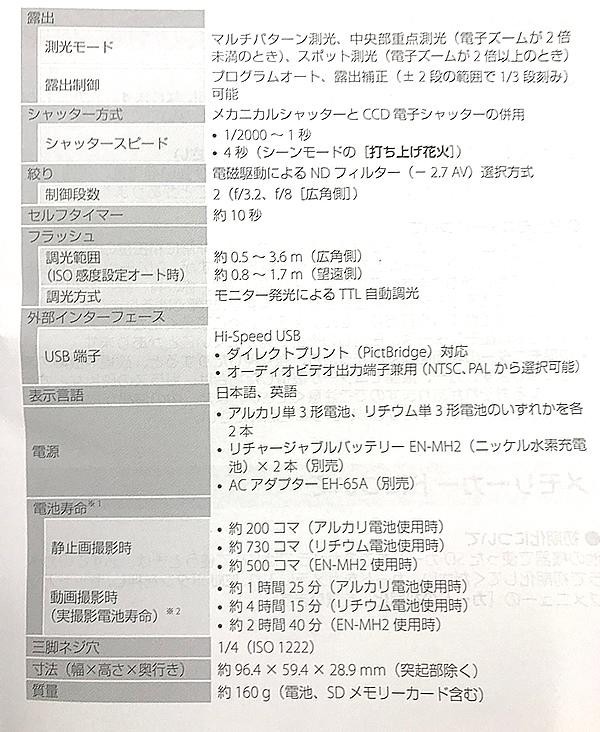 | 付属品 | ストラップ、アルカリ単3形電池(2本)、USBケーブル(UC-E16)、取扱説明書、保証書(保証期間:1年) |