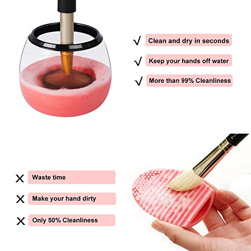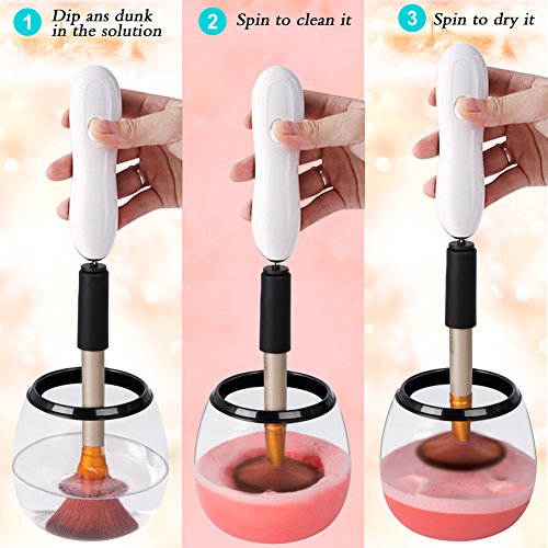 - ♥ Faster and More Time-Saving - The newly upgraded Electric Makeup Brush Cleaner Just three steps to clean makeup brushes. 1. Dip and Dunk 2. Spin to Rinse 3. Spin to Dry.