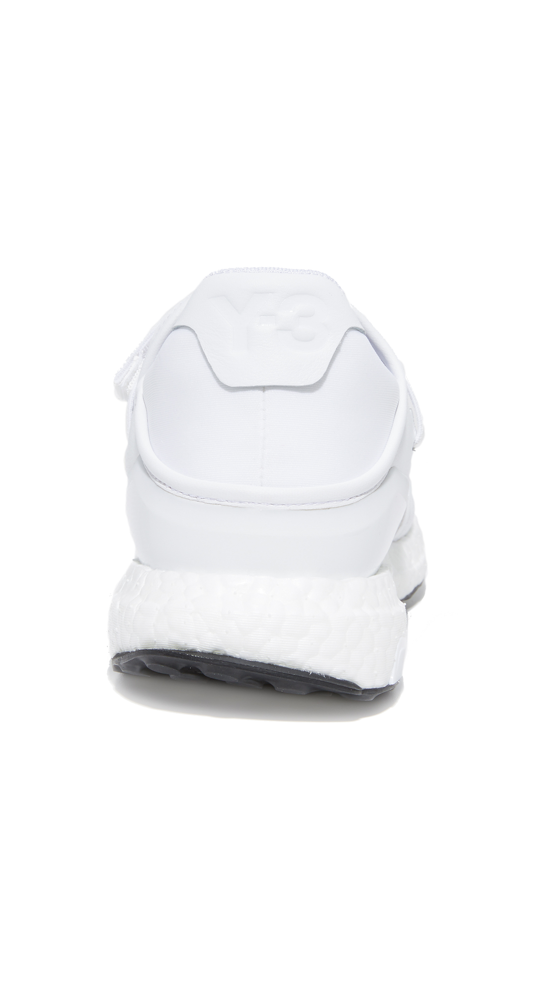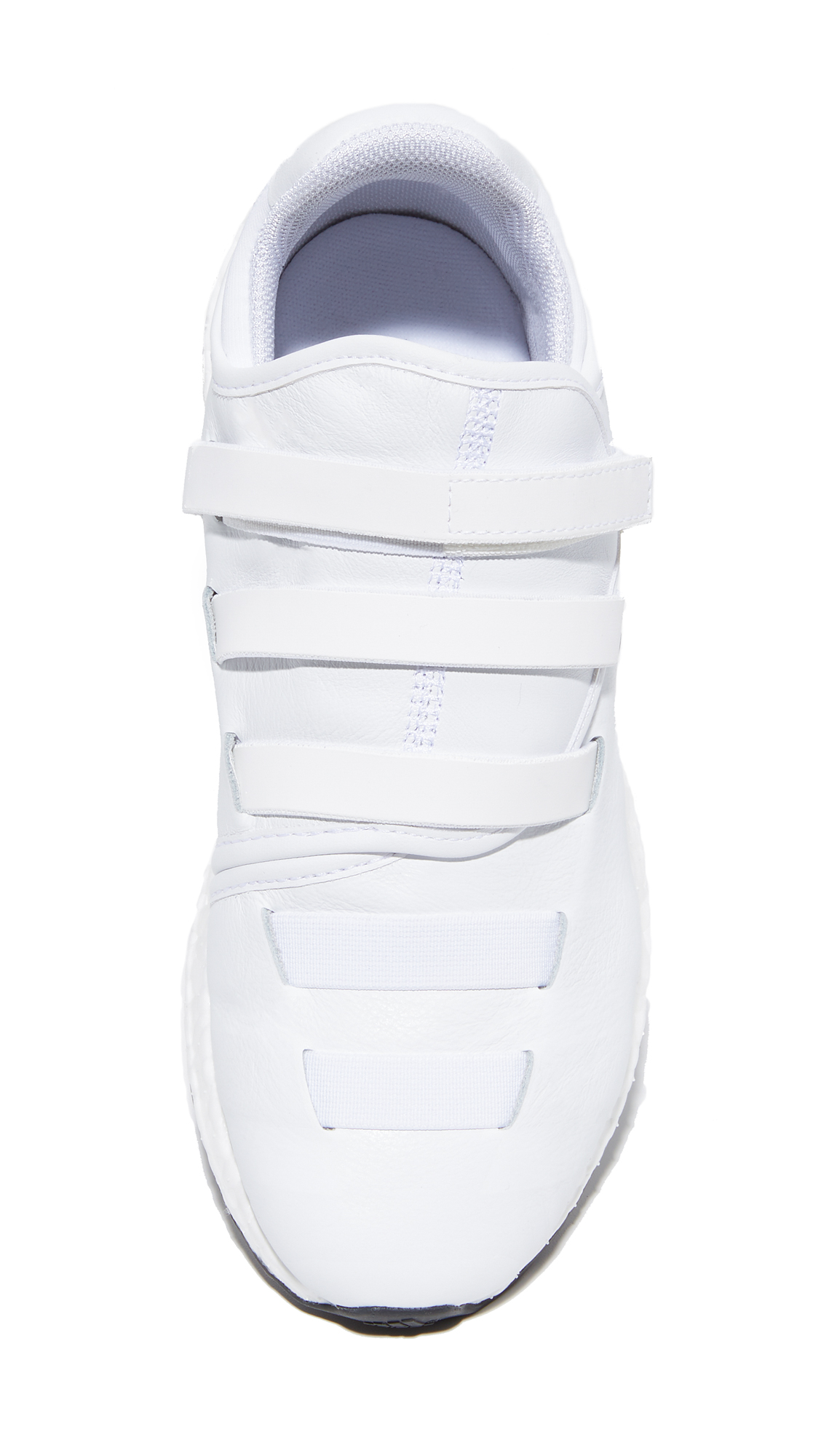 Reflective stripes and woven elastic strips add a unique, modern touch to these wrinkled leather Y-3 sneakers. A Velcro strap layers over the wide tongue. Logo detailing at the neoprene heel cap. Textured foam platform. Rubber sole.