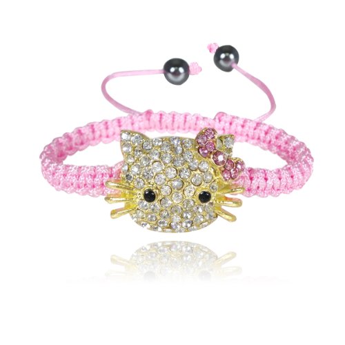 This shamballa inspired bracelet features Kitty's face and two 7mm highly polished hematite beads at the end. The design is simple yet eye-catching. The bracelet is adjustable and can fit arms of all sizes. Simply pull the cords to make the bracelet smaller, and the sides to expand the bracelet. Available in colors pink, white, black, beige or purple. Adjustable bracelet; can be worn by children and even adults! Pull the cords to reduce the circumference, and the sides to expand. Bracelet Circumference: minimum 5.25 inches, expanded 8.75 inches. Dimensions: Large beads 10mm diameter; Small beads 7mm diameter. Material: Crystal Rhinestones, Cord, Hematite Beads.Feature