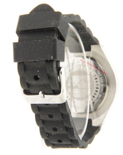 -. Feature : Japanese quartz movement / Flame-fusion crystal; stainless steel case; black silicone strap / Day, date and 60 second subdials / White dial with black hands and silver tone arabic numerals; luminous; crystal accented stainless steel bezel / Water resistant to 99 feet (30 M): withstands rain and splashes of water, but not showering or submersion