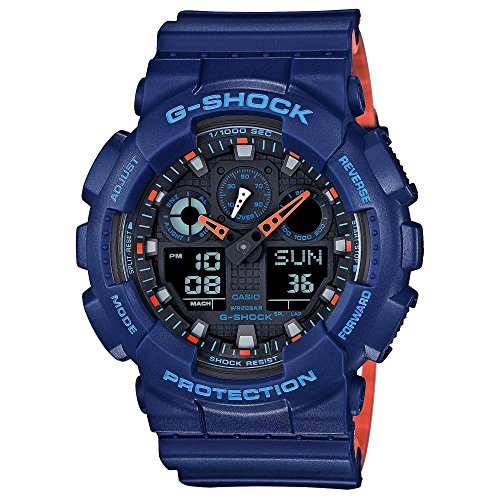 Brand, Seller, or Collection Name:Casio Model number:GA-100L-2ACR Part Number:GA-100L-2ACR Item Shape:Round Dial window material type:Mineral Display Type:Analog and digital Clasp:Buckle Metal stamp:none Case material:Resin Case diameter:5.1 centimeters Case Thickness:14.5 millimeters Band Material:Resin Band length:Men's Standard Band width:28.8 millimeters Band Color:multi Dial color:Black Bezel material:Resin Bezel function:Stationary Calendar:Day, date, and month Special features:World time Item weight:2.40 Ounces Movement:Quartz Water resistant depth:660 Feet