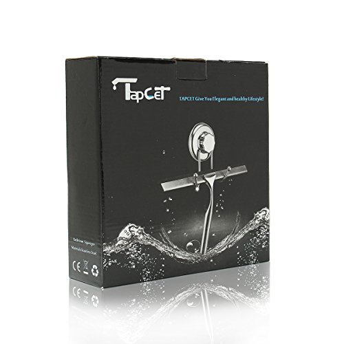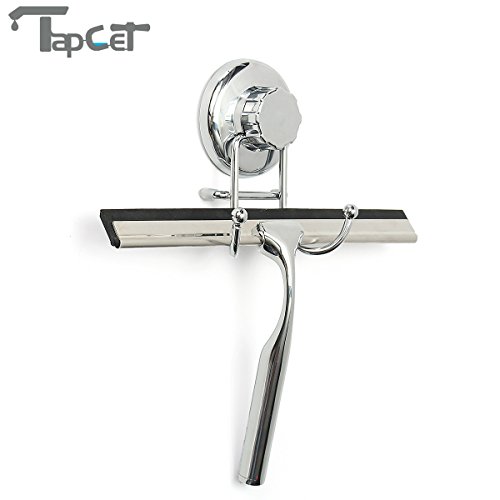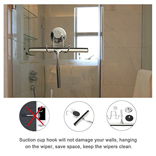 【PRACTICAL DESIGN】Suction cup and hook keeps it stored on the wall. No more tools, drilling, screws and holes; Heavy-duty squeegee is made of durable stainless steel and silicone. You can feel the weight of it in your hand! Looks refined & stylish in any bathroom