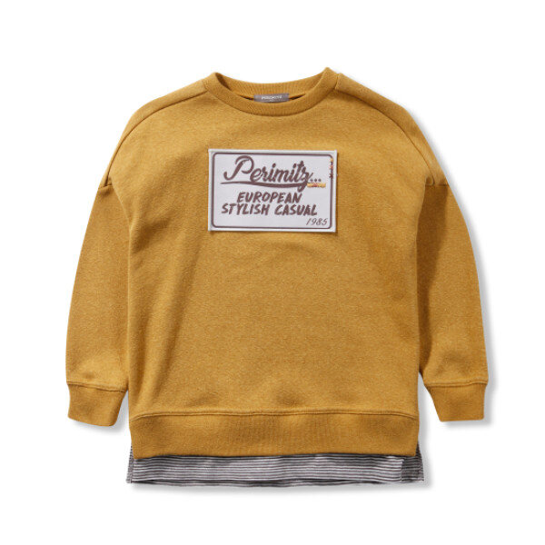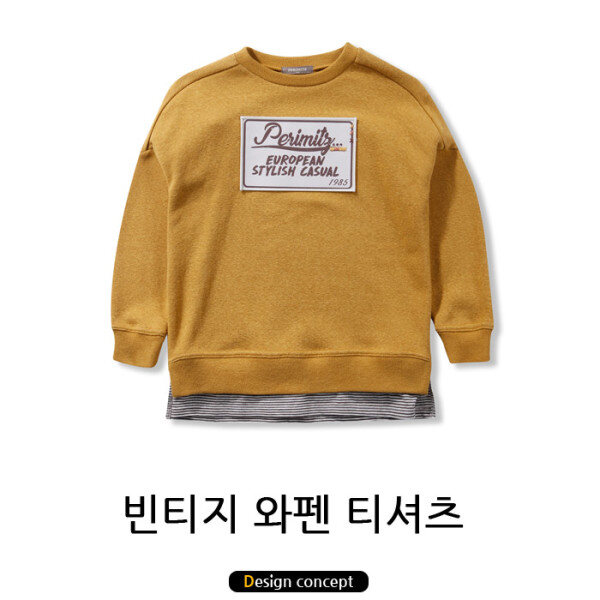 변형이중지 원단을 사용하여 부드럽고 텐션이 좋으며, 밑단에 배색 스트라이프를 대어단품만으로도 예쁘게 코디가 가능합니다.가슴에 포인트로 와펜이 있어 더욱 멋스럽습니다